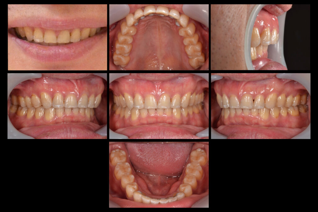 噛み合わせが加齢とともに深くなり、行き場を失った前歯が飛び出し、隙間ができました。また、下の前歯が内側(舌側)に倒れ込み、上の歯ぐきを突き刺さしていました。