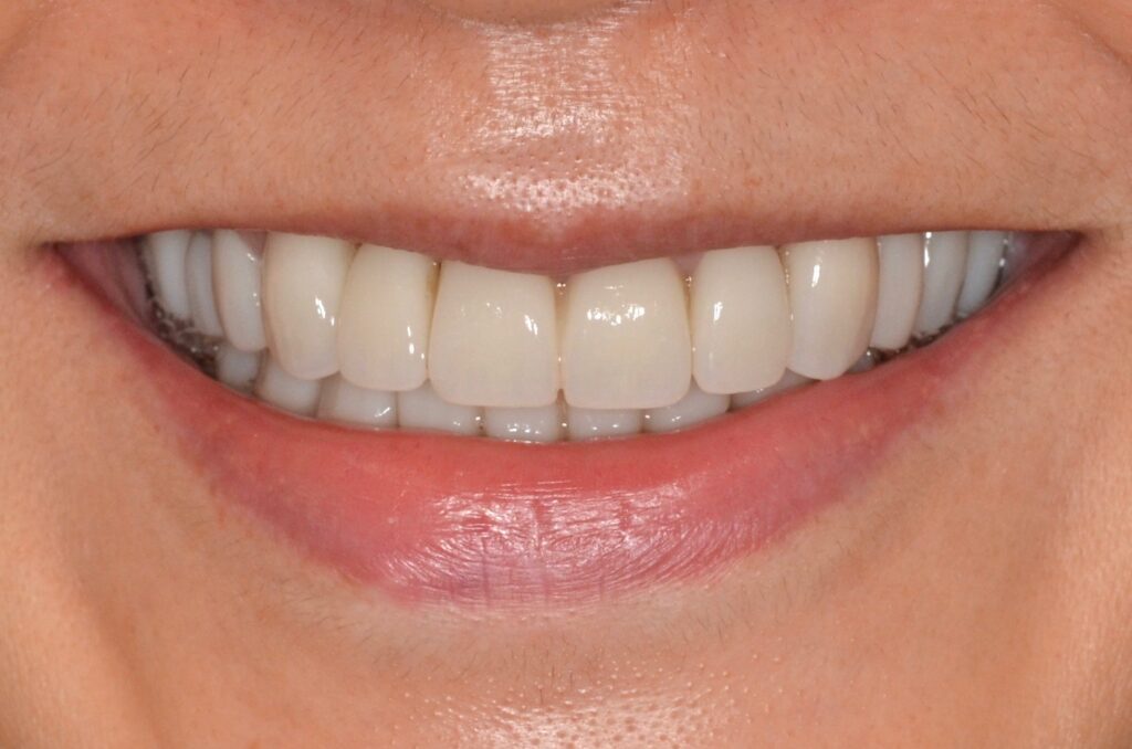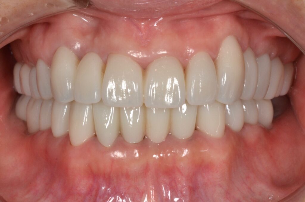 傷んだ歯牙が多くありましたが、抜歯部位はインプラントで補綴し写真上でも分からないくらい歯茎が安定しています。