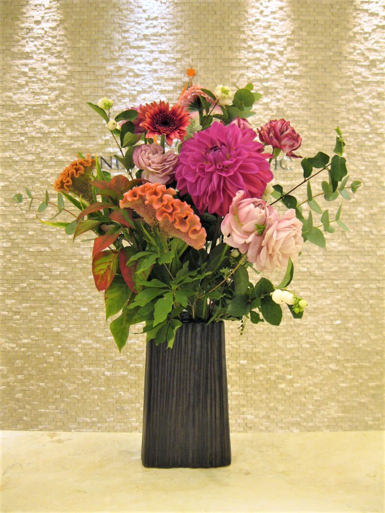 花材は、「ガーベラ」「ダリア」「バラ」「ケイトウ」「シンフォリカルポス」です。