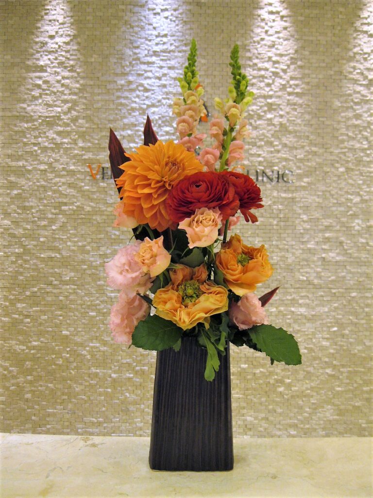 今週の花材は、「スナップ」「ダリア」「ラナンキュラス」「バラ」「トルコキキョウ」「ドラセナ」です。